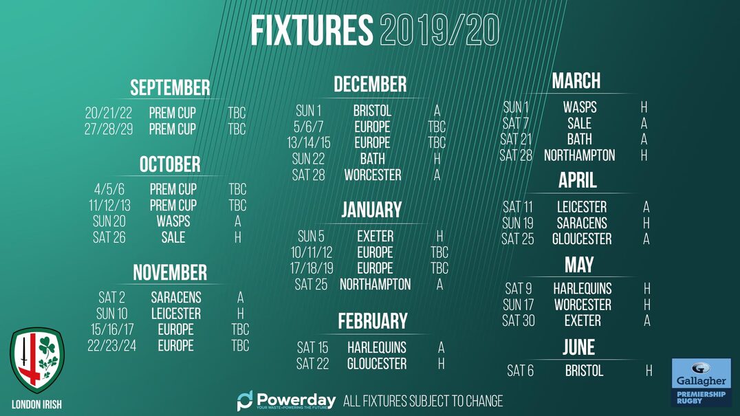 London Irish will begin their Gallagher Premiership campaign at the Ricoh Arena against Wasps in their opening game of the 2019/20 season.