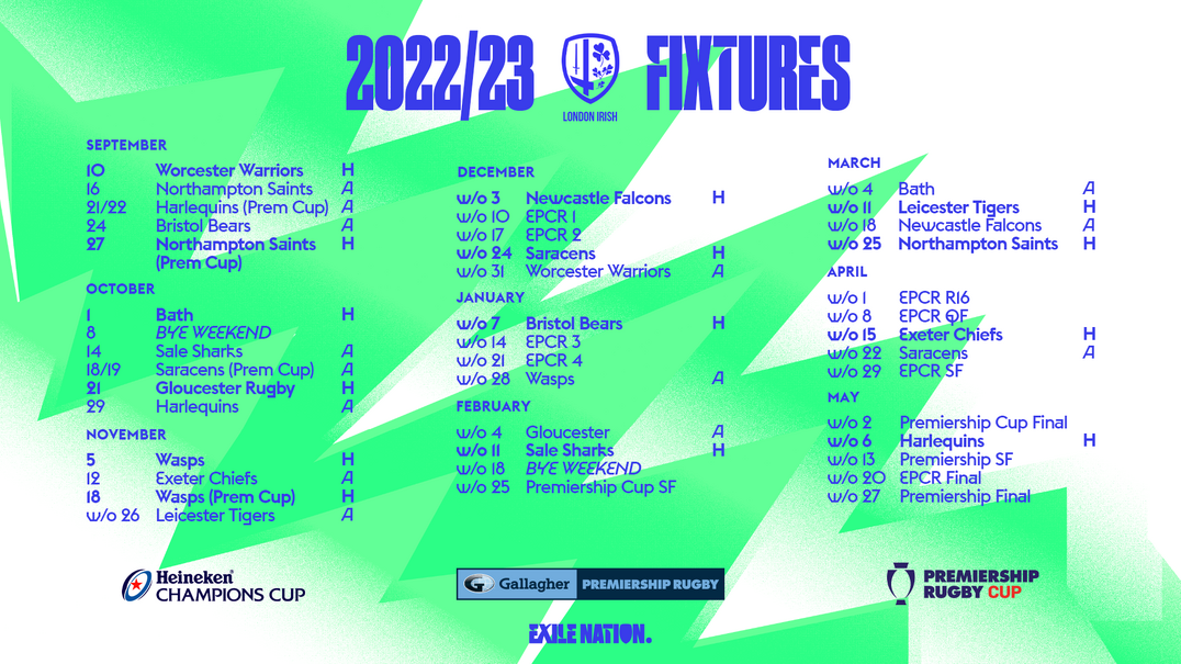 London Irish’s 2022/23 Gallagher Premiership and Premiership Rugby Cup fixtures