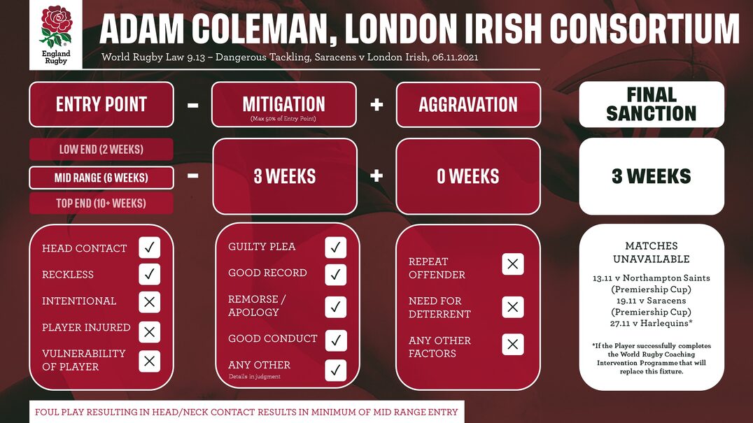 Coleman accepted the charge and was given a three-match suspension by the independent disciplinary panel comprising Gareth Graham with Leon Lloyd and Olly Kohn. He is free to play again on 30 November 2021.