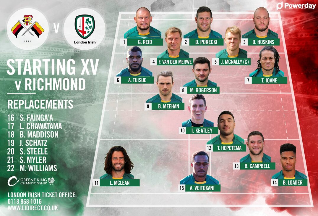 London Irish: 15 Alivereti Veitokani, 14 Ben Loader, 13 Bryce Campbell, 12 Terrence Hepetema, 11 Luke McLean, 10 Ian Keatley, 9 Ben Meehan, 1 Gordon Reid, 2 Dave Porecki, 3 Ollie Hoskins, 4 Franco van der Merwe, 5 Josh McNally ©, 6 Albert Tuisue, 7 TJ Ioane, 8 Matt Rogerson