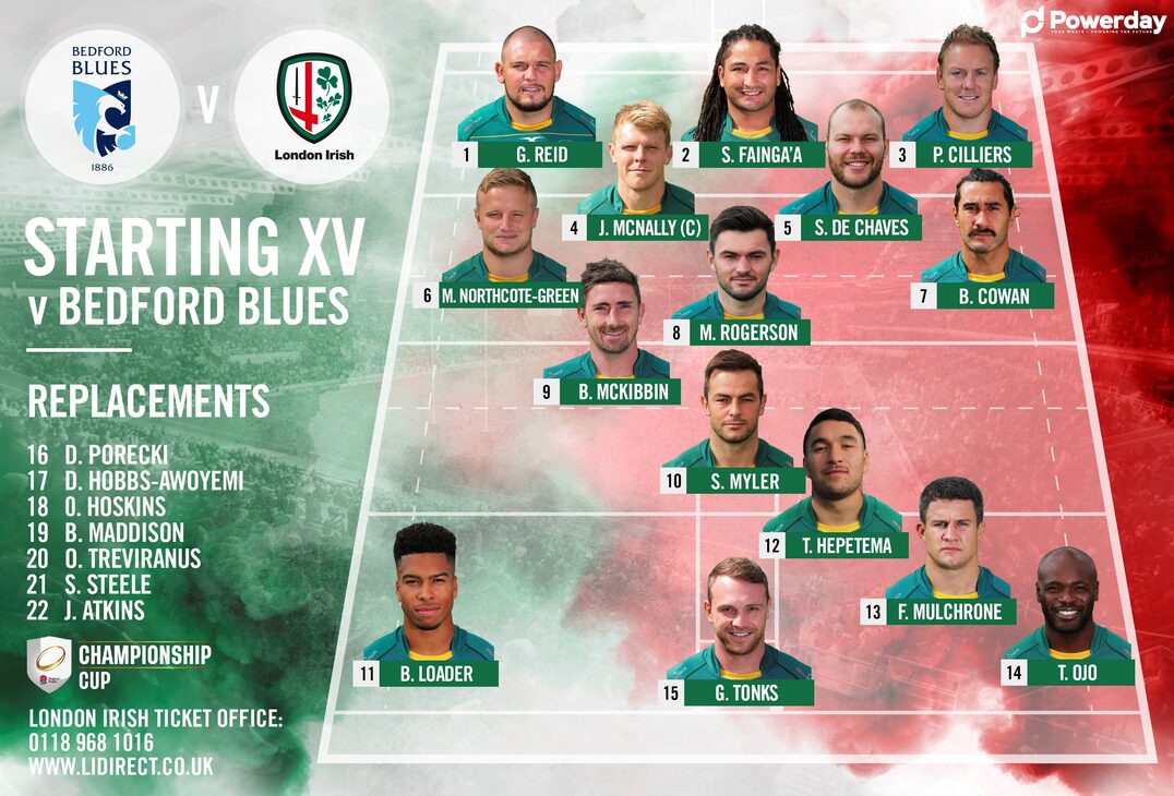 London Irish have named the team to face Bedford Blues in Round 4 of the Championship Cup at Goldington Road tomorrow (kick-off 3pm).