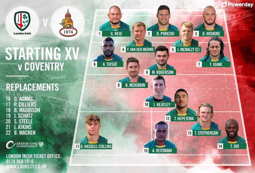 London Irish: 15 Alivereti Veitokani, 14 Topsy Ojo, 13 Tom Stephenson, 12 Terrence Hepetema, 11 Ollie Hassell-Collins, 10 Ian Keatley, 9 Brendan McKibbin, 1 Gordon Reid, 2 Dave Porecki, 3 Ollie Hoskins, 4 Franco van der Merwe, 5 Josh McNally ©, 6 Albert Tuisue, 7 TJ Ioane, 8 Matt Rogerson