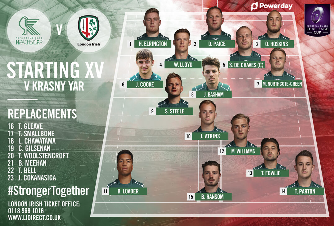 London Irish: 15 Ben Ransom, 14 Tom Parton, 13 Tom Fowlie, 12 Matt Williams, 11 Ben Loader, 10 Jacob Atkins, 9 Scott Steele, 1 Harry Elrington, 2 David Paice, 3 Ollie Hoskins, 4 Will Lloyd, 5 Sebastian De Chaves (c), 6 Jack Cooke, 7 Max Northcote-Green, 8 Josh Basham