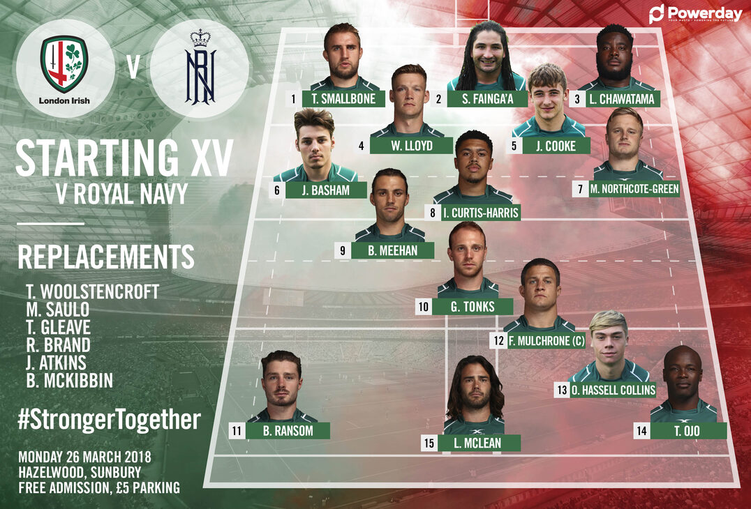 London Irish have named a strong side for tonight’s game against the Royal Navy at Hazelwood (kick-off 7.30pm).