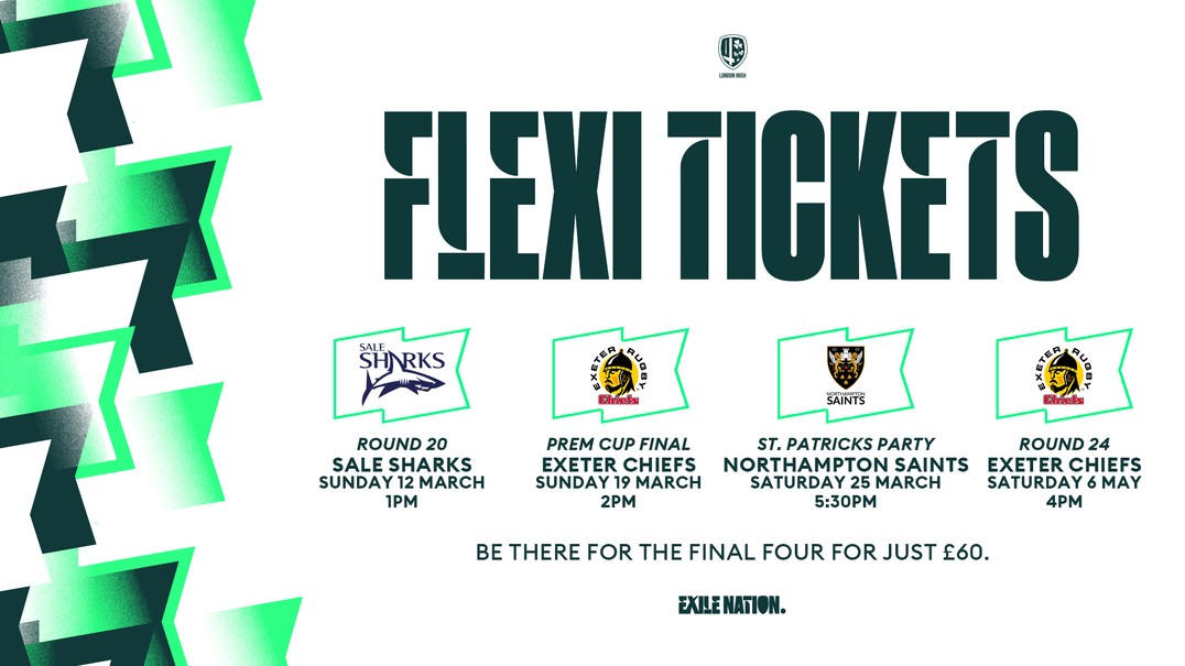 Tickets are now on general sale for London Irish’s final 2022/23 Gallagher Premiership regular season fixture against Exeter Chiefs on Saturday 6 May (kick-off 4pm) at the Gtech Community Stadium.