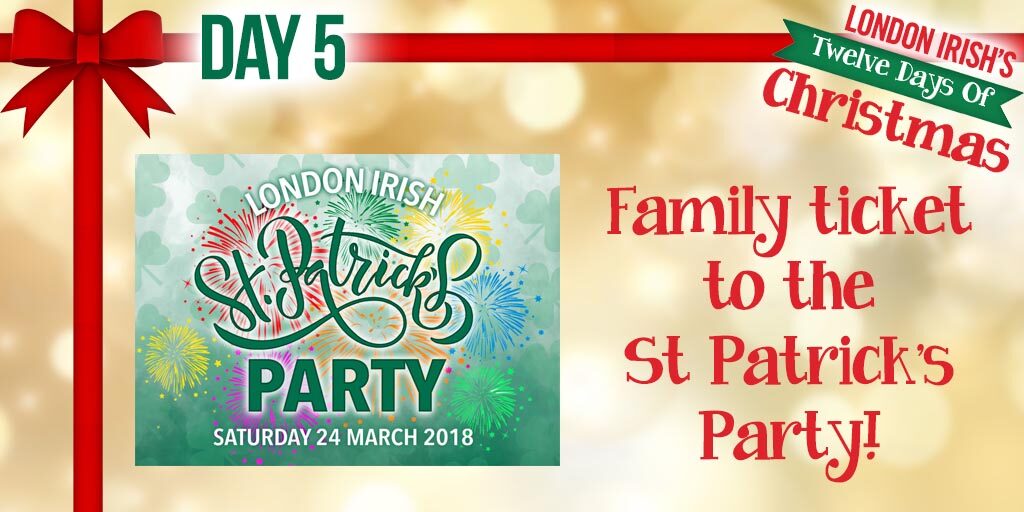 On the 5th Day of our Twelve Days of Christmas we are offering you the chance to win a family ticket to the St Patrick’s Party on 24 March 2018! The highlight of London Irish’s calendar, our annual St Patrick’s Party combines a great game of Aviva Premiership rugby with a cracking day of non-stop entertainment. A family ticket consists of two adult and two concession tickets, worth up to £136!