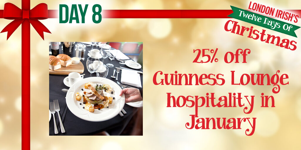 For the 8th Day of our Twelve Days of Christmas we have got a hospitality offer for you! You can save 25% off all bookings in the Guinness Lounge for home games in January if you book before Friday 22 December. The Guinness Lounge offers you exclusive use of a private suite, premium padded seats, lunch chosen from a menu on the day and a complimentary match day programme. What better way to treat your loved ones than spoiling them with a VIP experience at a London Irish match day? Perfect for a Christmas present, to mark a special occasion or even just to get out of the cold and beat the January blues!